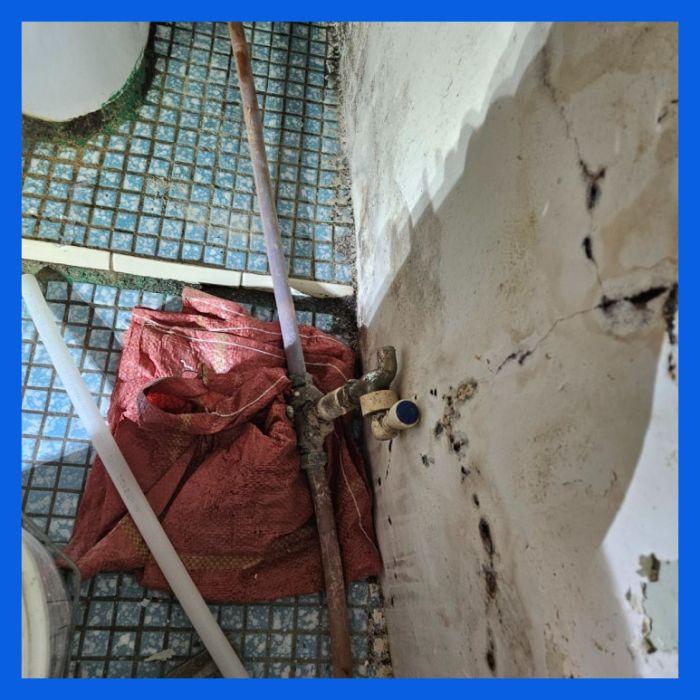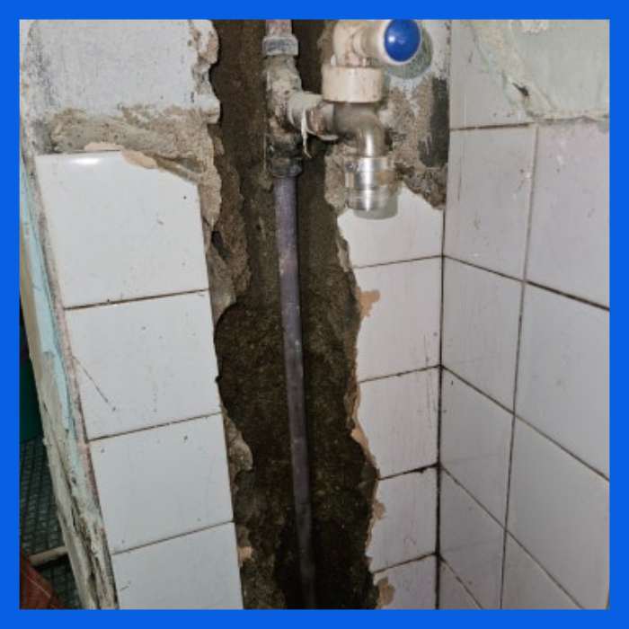 확정된 지점의 벽면을 조심스럽게 파쇄하자 매립되어 있던 노후 동배관이 모습을 드러냈습니다. 오랜 세월을 견디지 못하고 배관 한쪽 면에 미세한 균열이 발생하여 물이 뿜어져 나오는 상태였습니다. 비눗물을 도포하여 기포가 발생하는 장면을 고객님께 직접 확인시켜 드림으로써 시공의 투명성을 높였습니다.