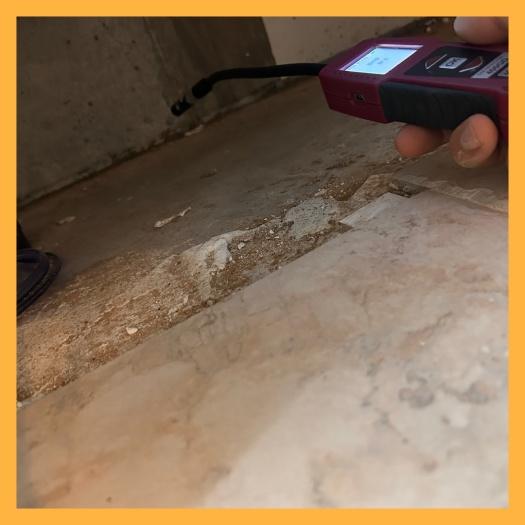 온수 배관의 누수를 확인한 후, 바닥 아래 매립된 정확한 지점을 찾기 위해 가스 탐지기를 투입했습니다. 배관 내부에 혼합 특수 가스를 주입하고 바닥재 틈으로 새어 나오는 가스를 센서로 추적하는 방식입니다. 거실과 주방 사이를 정밀 탐색하던 중 가스 탐지기 수치가 급격히 상승하는 구간을 발견했습니다.