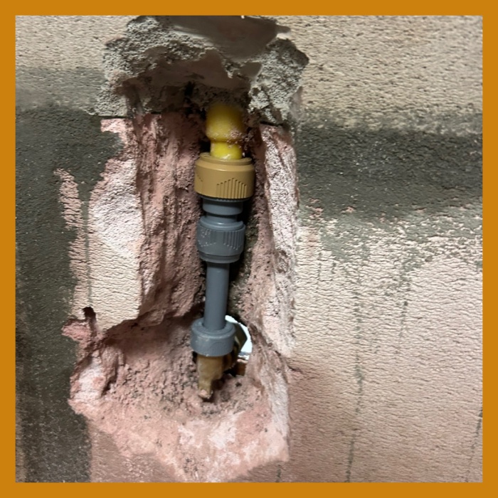 청음식 탐지기(미세한 배관 소리를 증폭하여 듣는 장비)를 통해 벽면 안쪽에서 새어 나오는 공기 소리를 포착했습니다. 위치를 특정한 후, 타일 손상을 줄이기 위해 정밀하게 범위를 설정하고 굴착을 진행했습니다. 벽면을 파내자 습기에 젖은 벽체와 함께 균열이 간 PPC 엘보 부위가 드러났습니다.